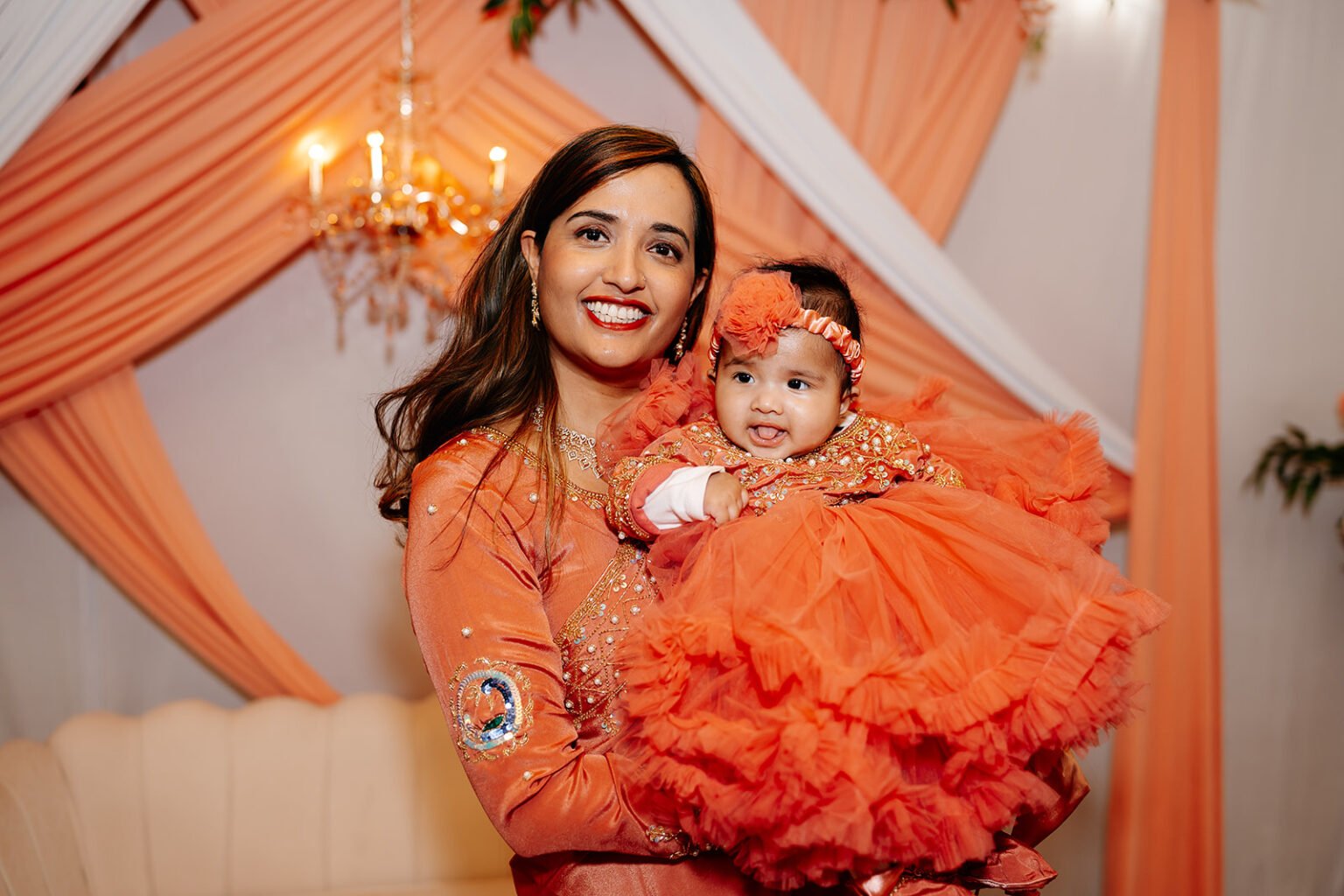 The celebration was absolutely stunning. The vibrant coral and orange color palette created such warmth throughout the Stables' beautiful barn space. Watching family members in gorgeous traditional attire dance, laugh, and celebrate this little one's milestone reminded me why I'm so passionate about documenting these cultural celebrations.